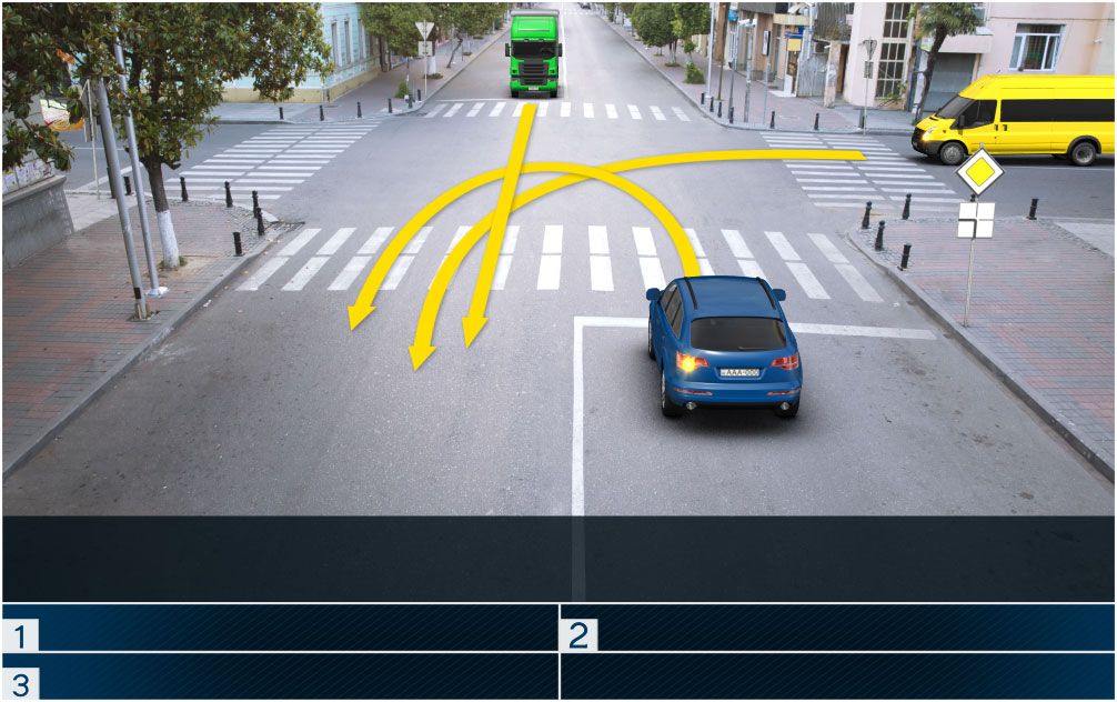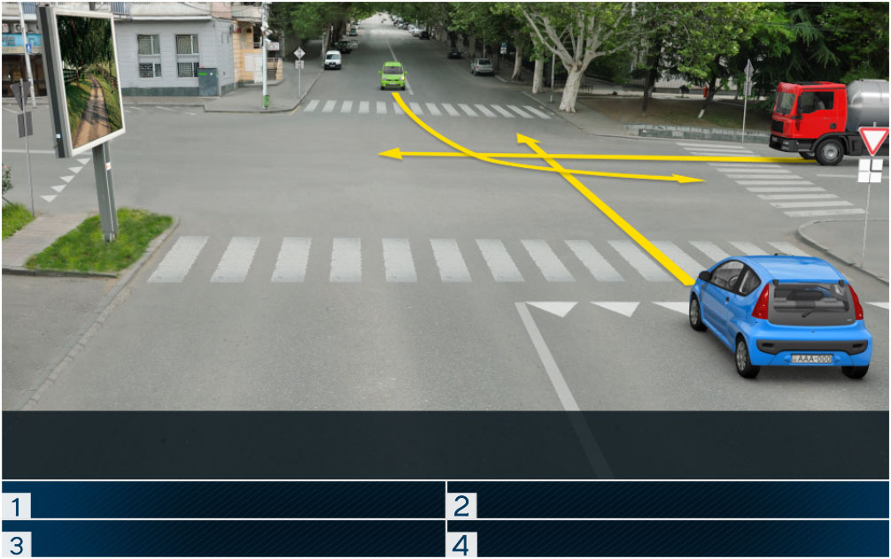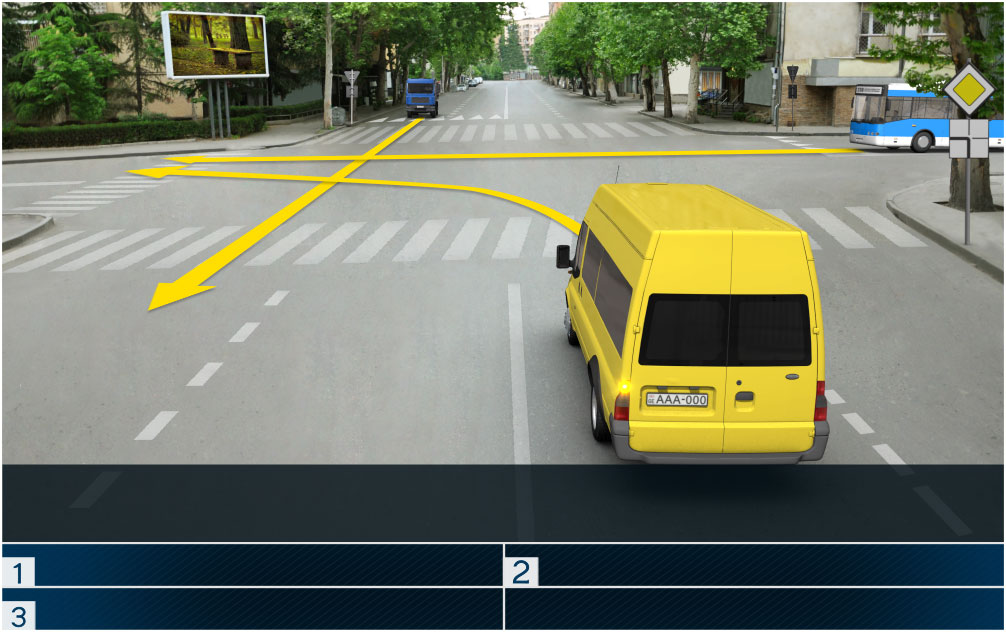 რომელი სატრანსპორტო საშუალების მძღოლის მიმართ წარმოექმნება გზის დათმობის ვალდებულება სატვირთო ავტომობილის მძღოლს ისრის მიმართულებით მოძრაობის შემთხვევაში, თუ ყველა შუქნიშანში ანთია ყვითელი მოციმციმე სიგნალი?