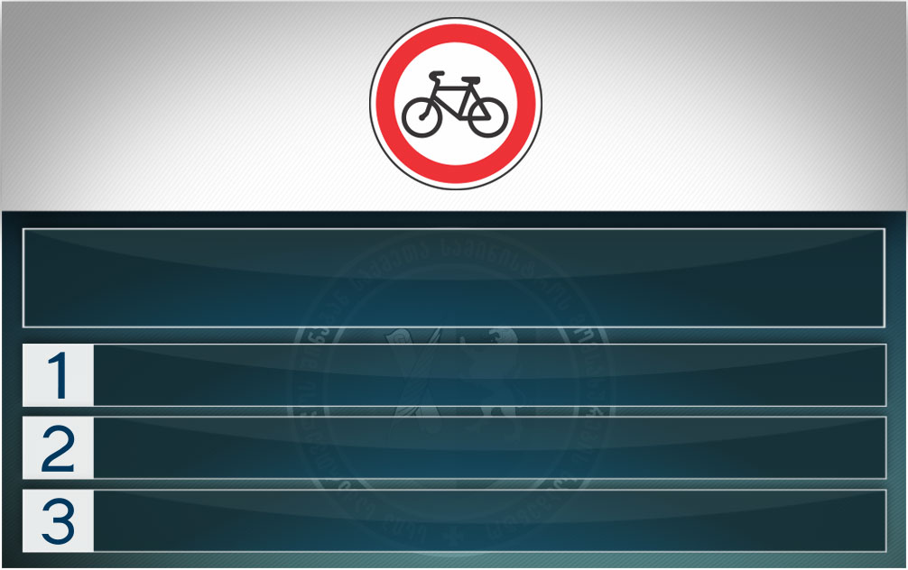 „საგზაო მოძრაობის შესახებ“ საქართველოს კანონის პირველი დანართის მე-3 თავის (ამკრძალავი ნიშნები) 3.9 პუნქტის თანახმად საგზაო ნიშანი 3.9 „ველოსიპედით მოძრაობა აკრძალულია” - კრძალავს ველოსიპედითა და მოპედით მოძრაობას.